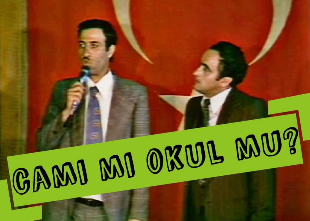 Kemal Sunal’ın Zübükzade İbraam Bey karakterini canlandırdığı Zübük filmindeki cami-okul çekişmesinin sahnesi. (1980, Atıf Yılmaz)