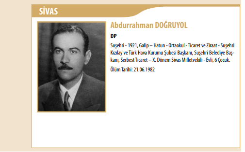 Abdurrahman Doğruyol’un biyografisine baktığımızda Wikipedia sayfasında dedesi Hacı Celâl Doğruyol’un da daha önce Suşehri Belediye Başkanı olduğu bilgisi veriliyor. Kesin olarak teyit edemesek de Doğruyol’un Suşehri eşrafından olmasına ve uzun siyasî kariyerine bakılırsa tutarlı bir bilgi. Siyasî kariyerinde işgal ettiği ilk makam DP Suşehri İlçe Başkanlığı olan Doğruyol, önce Suşehri Belediye Başkanı, 1954 seçimlerinde de Sivas Mebusu olarak seçiliyor. 1957 seçimlerinde ikinci kez milletvekili olamasa da aktif siyasetle bağlarını koparmıyor.