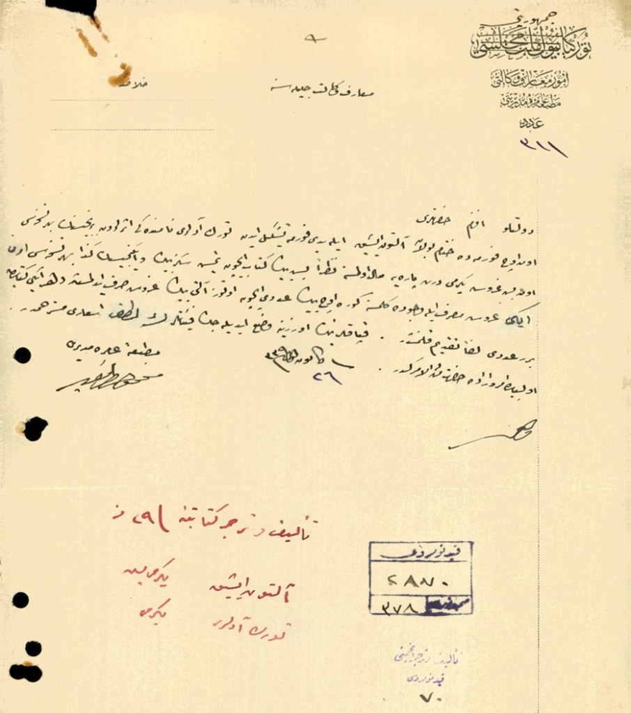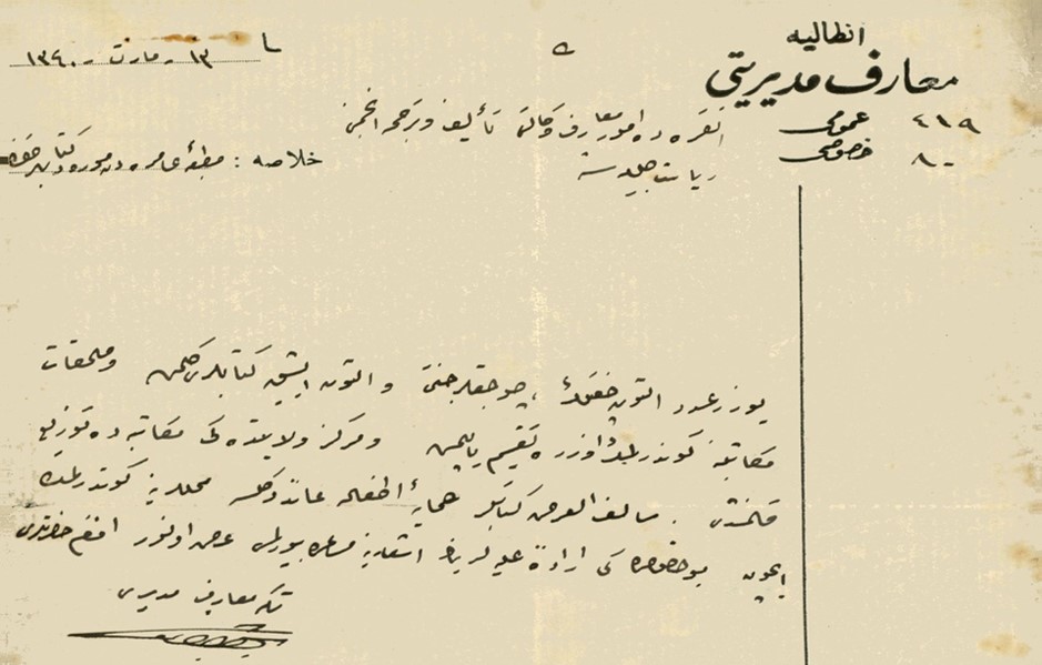 Yüz adet Altın Çiftlik, Çocuklar Cenneti ve Altın Işık kitapları gelmiş ve mülhakat mükâtebine gönderilmek üzere taksim yapılmış ve merkez vilayetteki mükâtebede tevzi kılınmıştır. Salifü’l-arz kitaplar Himaye-i Etfal’e ait değilse mahallerine gönderilmek için bu husustaki irade-i aliyyelerinin işarına müsaade buyurulması arz olunur efendim hazretleri.