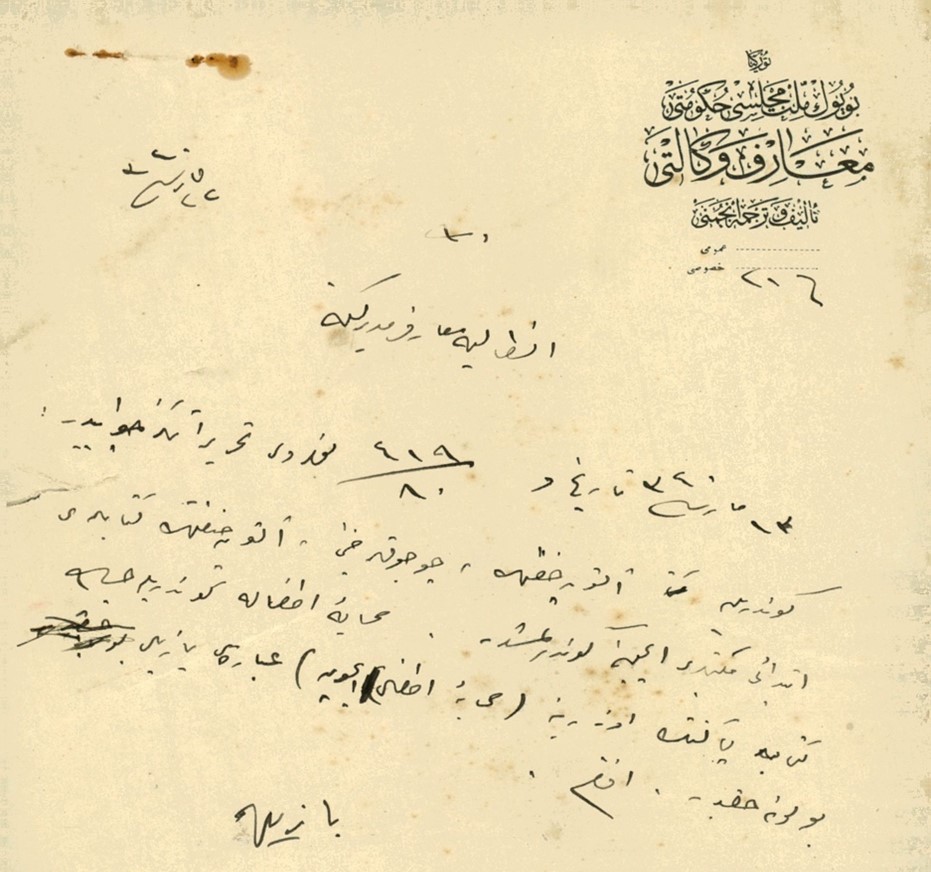 Ankara’da Umur-ı Maarif Vekaleti Telif ve Tercüme Encümeni Riyaset-i Celilesine